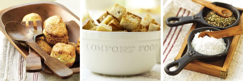Keep the decorating low key to match the casual mood. Set up a self–serve station on a buffet or side table, includng simple white ceramic bowls and plates, glass beer mugs and flatware. White stoneware casseroles and servicing dishes stamped with the words "Comfort Food" set the mood perfectly. Use woven chargers and trays as trivets. Serve bread or salad in rustic wood bowls with wood utensils. Colorful napkins and runners look particularly cheerful alongside the simple, natural materials. We matched a set of ticking stripes with a coordinating floral print set, and bundled them with fragrant sprigs of rosemary.