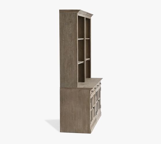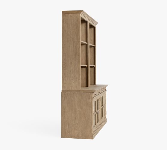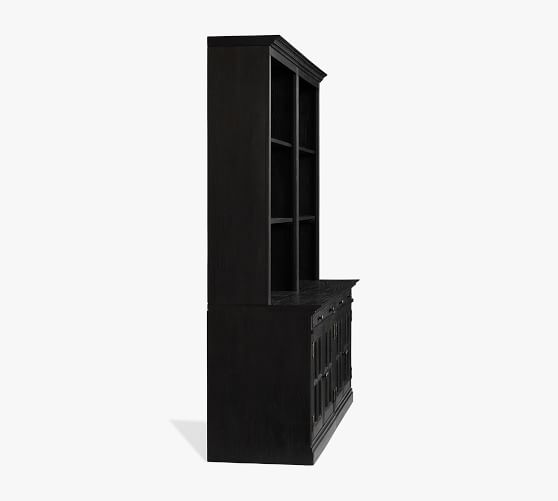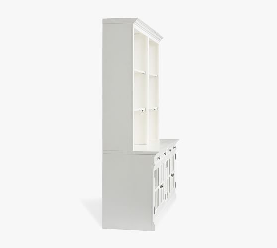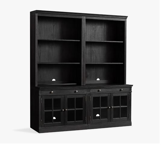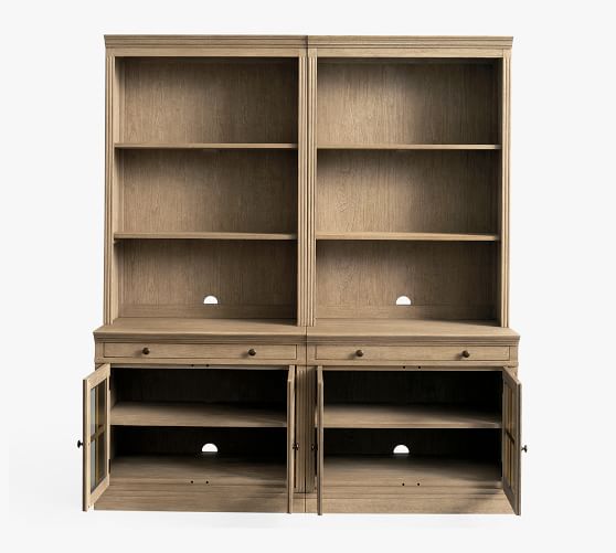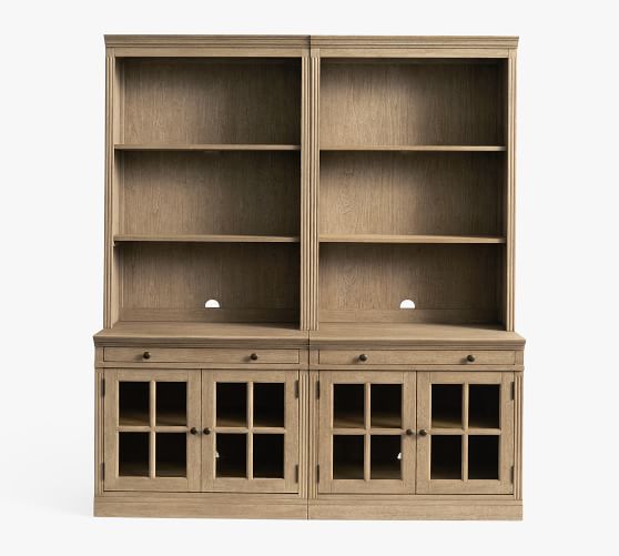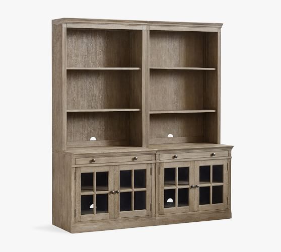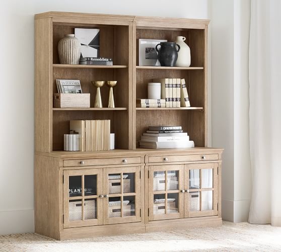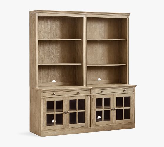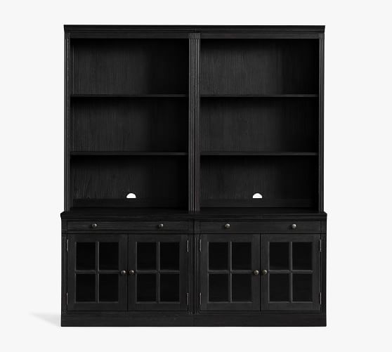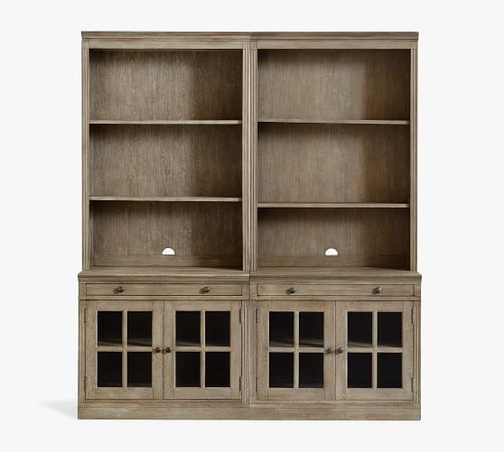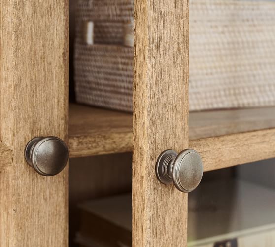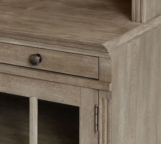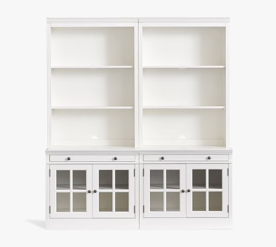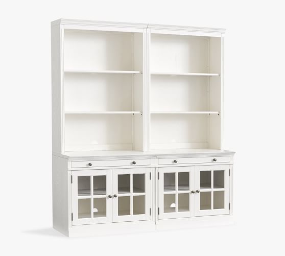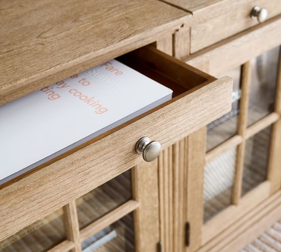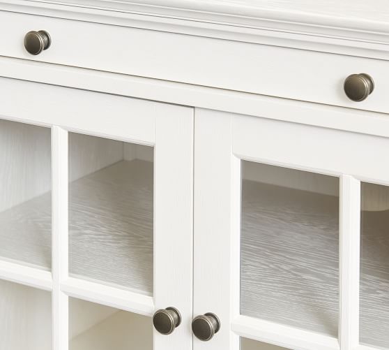- Glass Door Cabinets each feature a thin drawer and an shelf that can adjust to seven different heights.