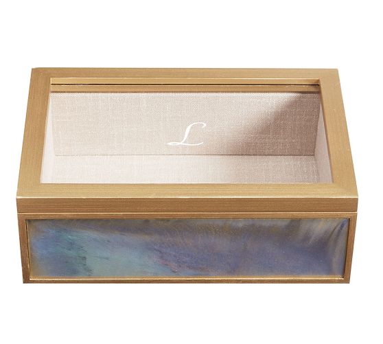 Iridescent abalone shells add beautiful depth and contrasting texture to this box’s poplar trim. The large-sized box can be monogrammed or personalized with a name to give as a special gift.