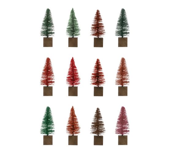 Bottle Brush Tree's On Wood Base, Set Of 12 - Red/Green Multi