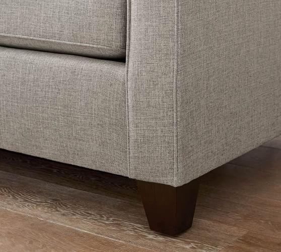 - Removable square tapered engineered wood legs feature a Bourbon finish.