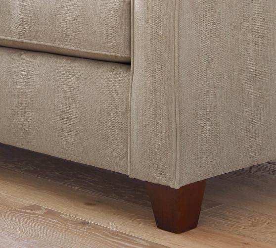 - Removable, square tapered, engineered wood legs feature a Bourbon finish.