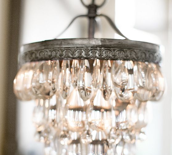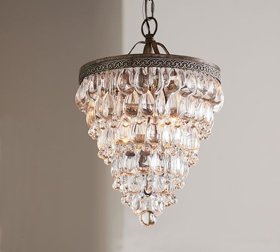 - Glass drops suspended from an antique-silver filigreed crown crafted of iron.
