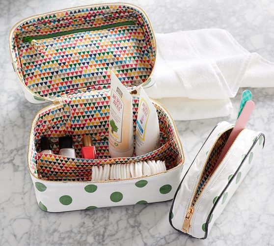 Two are better than one. Our handled cosmetic case has pockets and dividers to keep you organized on longer trips while the smaller pouch holds essentials in your tote or carry-on.
