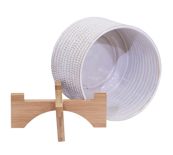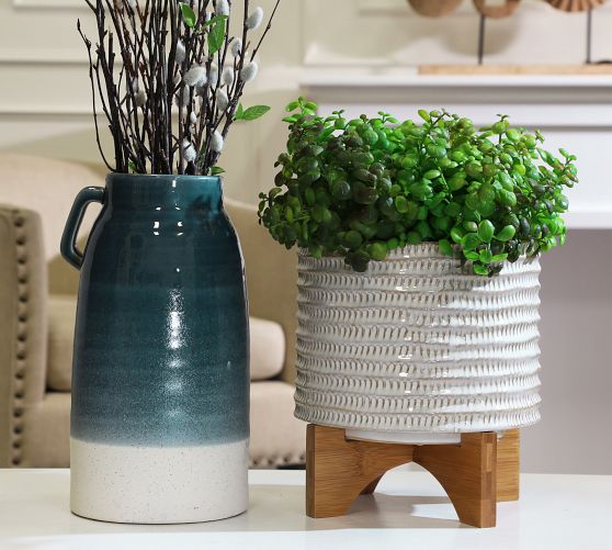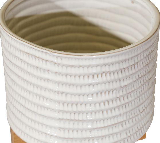 Add a distinctly handmade touch to your indoor and outdoor gardens with our Hazel Textured Ceramic Planter on Wooden Stand. The water-tight planter is finished with a textured glaze and sits firmly on a smooth pine base, making for a striking contrast of materials and textures.
