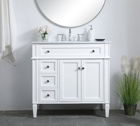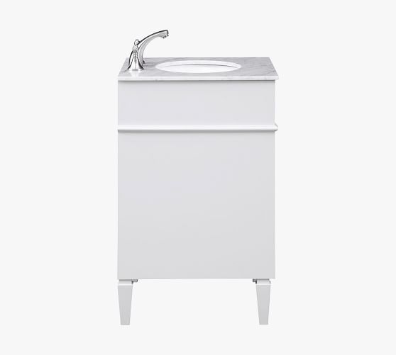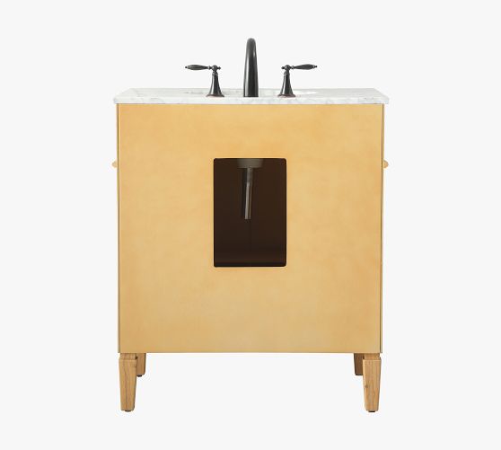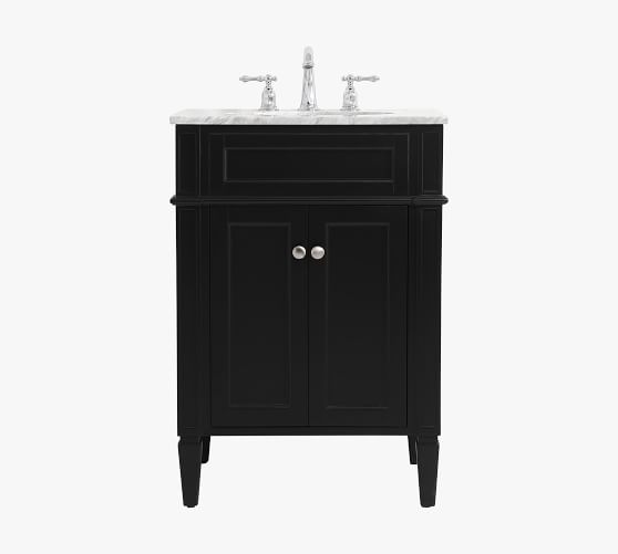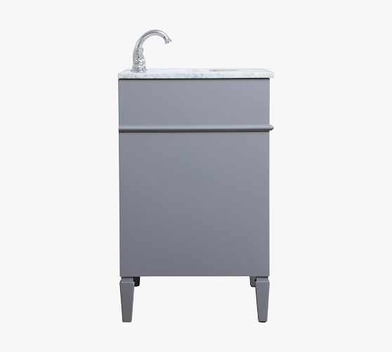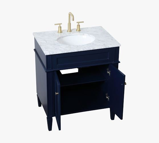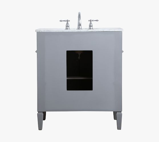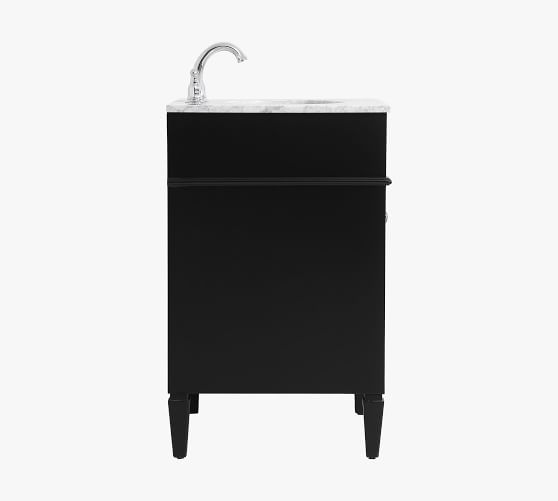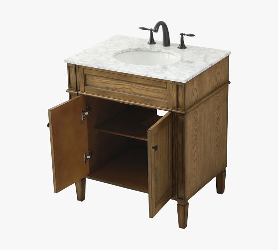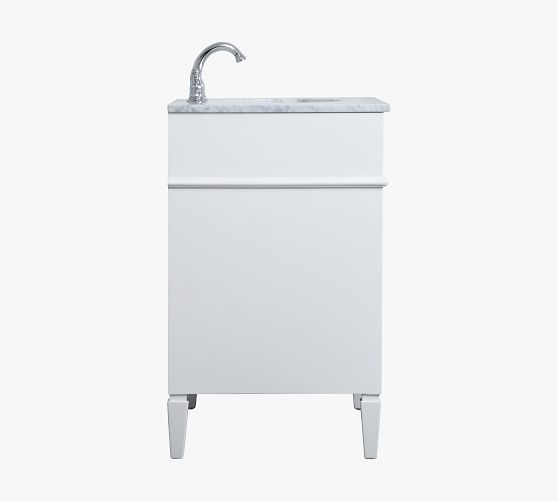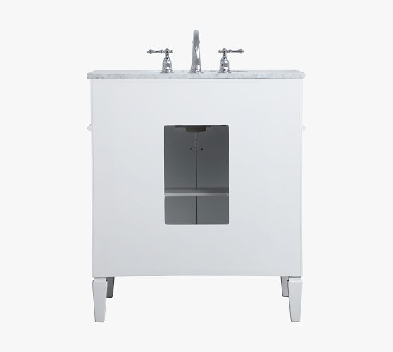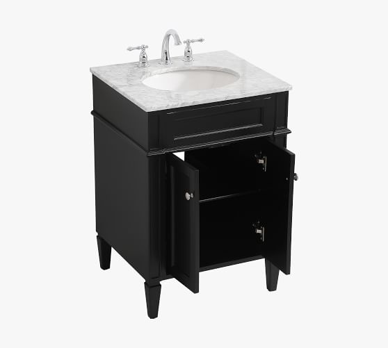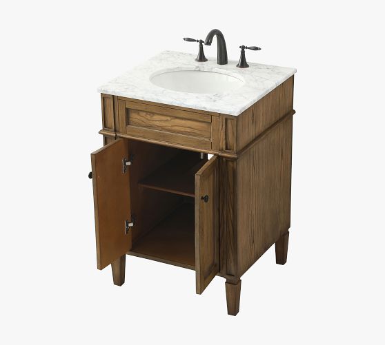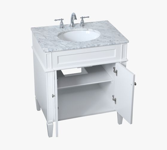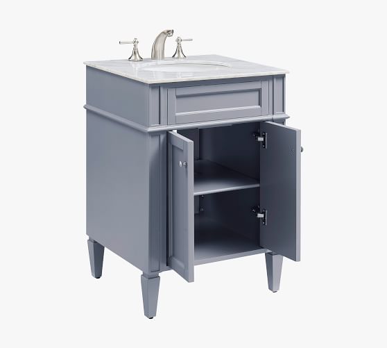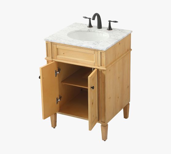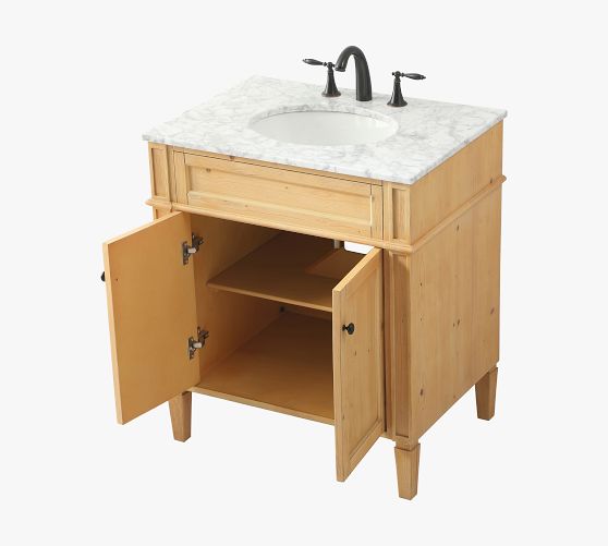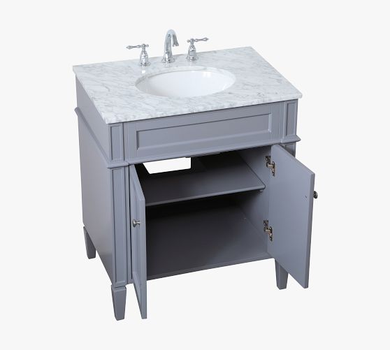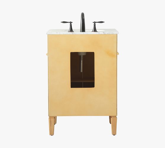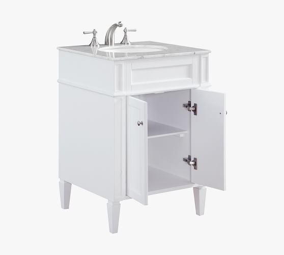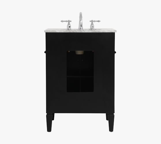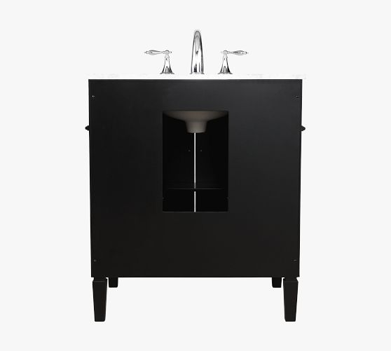 - Features a sink, one faux top center drawer and a closed cabinet with a center shelf.