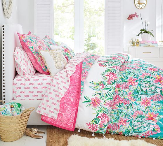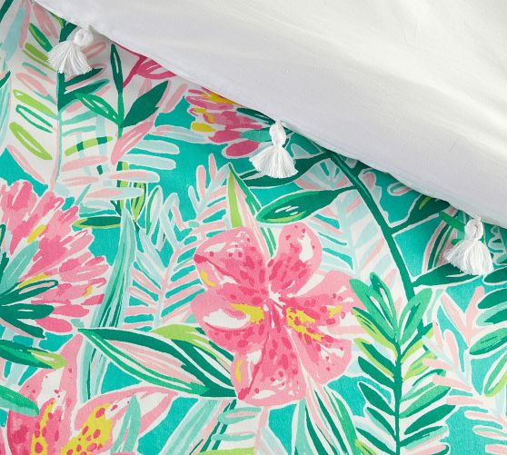 - Live and dream in color with this exclusive Jungle Lilly print. Featuring vibrant colors and tropical designs, this bedding brings a feeling of happiness. Detailed with fun, flirty tassels, it was imagined exclusively for Pottery Barn by Lilly Pulitzer, the iconic brand known for its vibrant hand-painted prints.