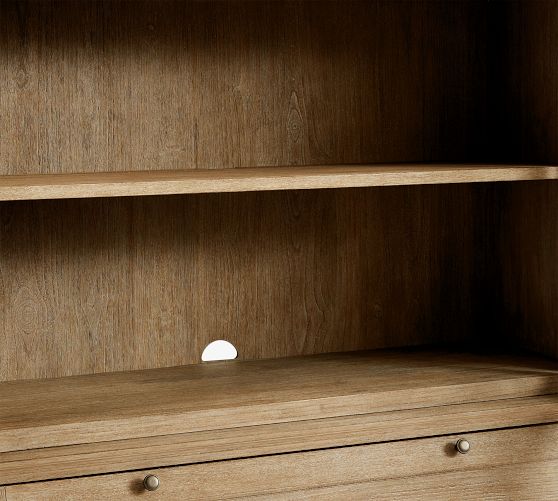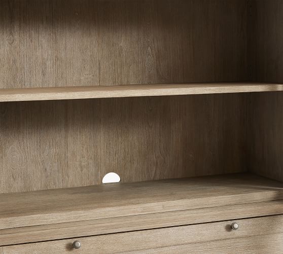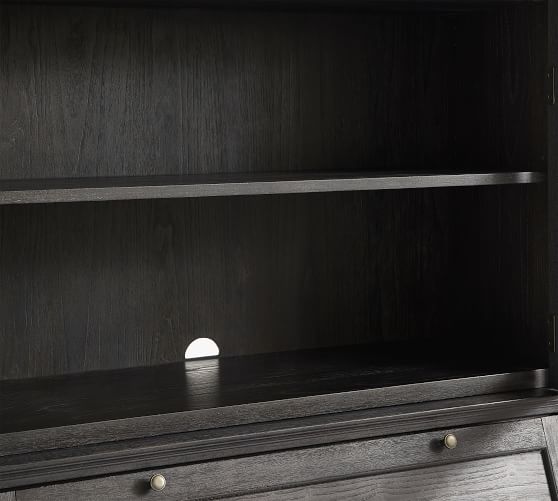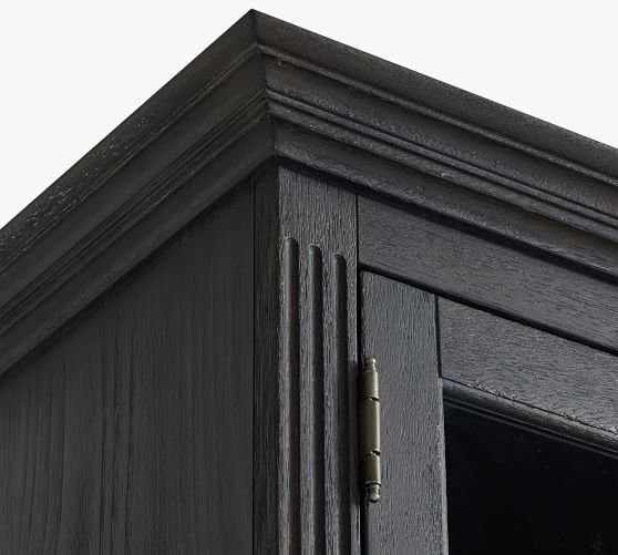 - Hutch features 2 shelves behind glass doors.