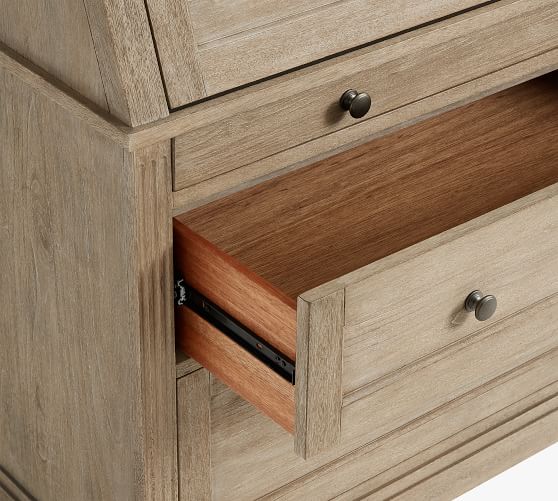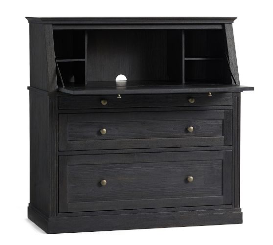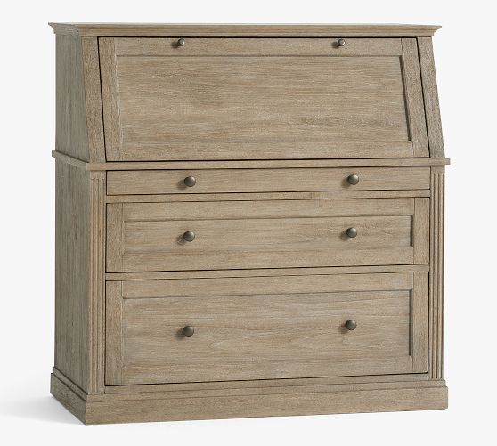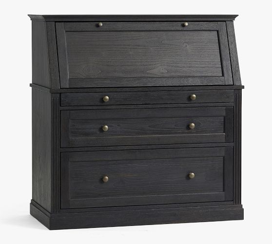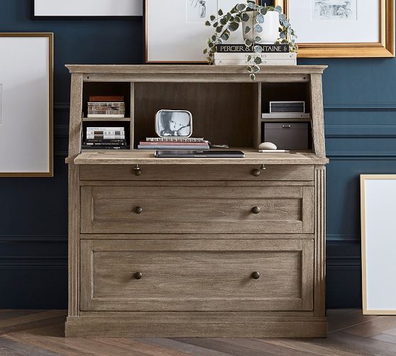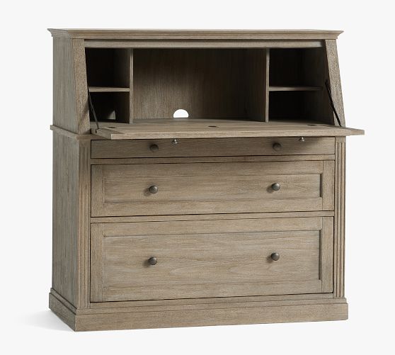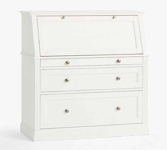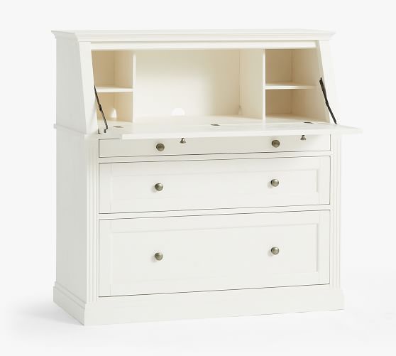 - Desk features drop down desk top with 4 side cubbies and 1 large center cubby. Desk has 3 drawers below drop down desk top; 1 small, 1 medium and 1 large file drawer.
