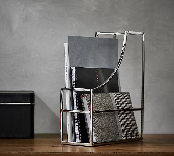 With its airy silhouette, our sturdy magazine holder is a chic essential for your home office or sitting area. Its polished-nickel finish reflects lights and colors, so you can showcase your personal color scheme.