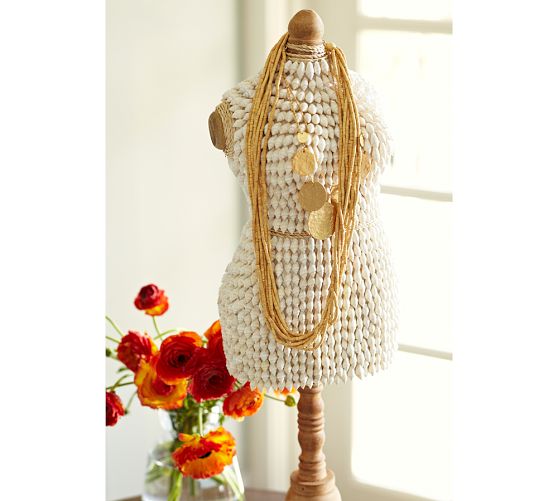Showcase your favorite necklaces on our handmade bust, crafted from mango wood and adorned with hundreds of real shells.