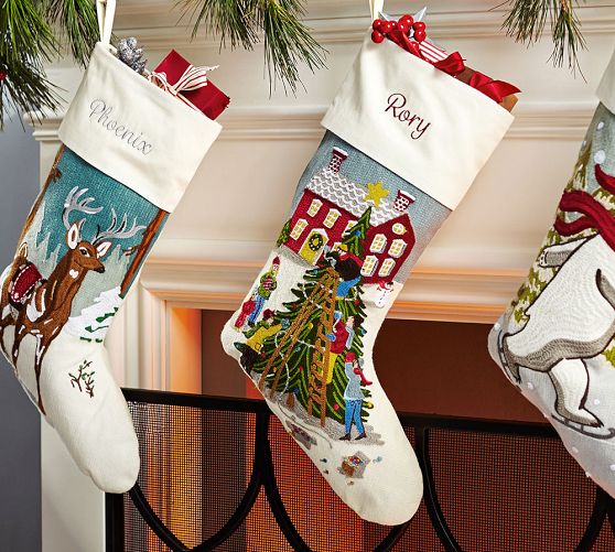 Trimming the holiday tree is one of our favorite traditions. Depicted in bright colors and embroidered for added texture and definition, this stocking will become a loved part of every Christmas.