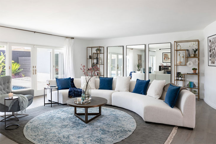 Rae calls the curved white couch in her formal living room her favorite piece, and Palomino notes that the blue swivel chair inspired the color palette for the entire space. Photo: Jess Isaac