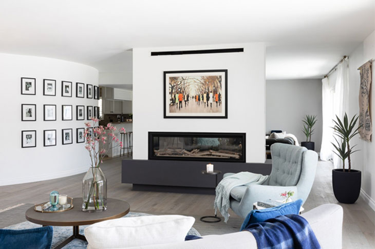 The formal living room and the family room are separated by a fireplace, and connected by a unique curved wall. Photo: Jess Isaac