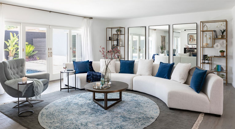 Rae calls the curved white couch in her formal living room her favorite piece, and Palomino notes that the blue swivel chair inspired the color palette for the entire space. Photo: Jess Isaac