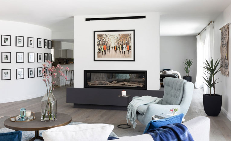The formal living room and the family room are separated by a fireplace, and connected by a unique curved wall. Photo: Jess Isaac