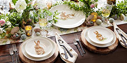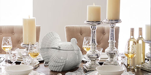 Warm, deep hues help make dinner guests feel more cozy. Gold pillar candles, mini gourds and pinecones can be assorted in large glass hurricanes or apothecary jars – just make sure that they are below eye level so your guests can see across the table comfortably. If you want to really get your hands dirty, you can clean out a pumpkin and use it as a planter – succulents and mums are a natural fit for this rustic creation.