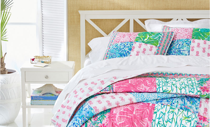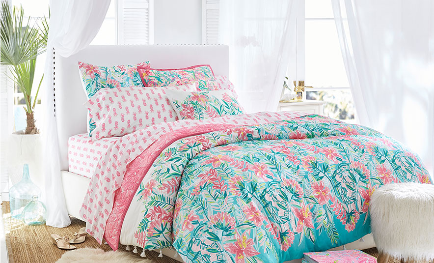 Embrace Lilly's zest for life – and print-on-print design – with tropical-inspired bedding and lamp shades detailed in color.