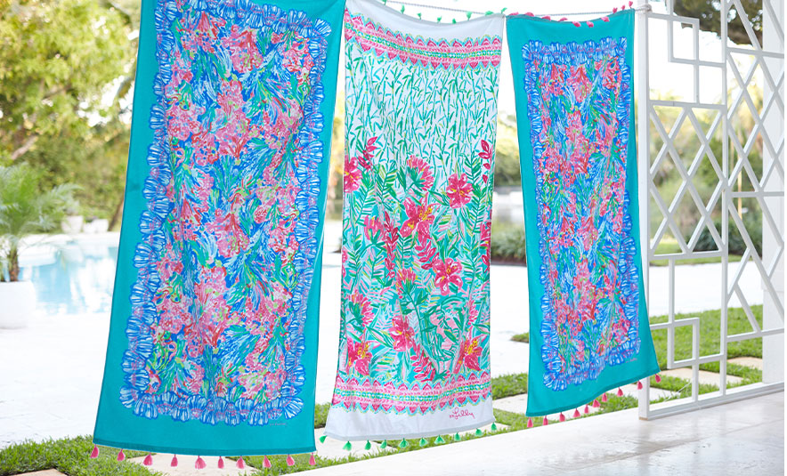 Palms, pineapples and flowers, oh my! Make a signature splash with bright towels, colorful cushions and bold umbrellas.