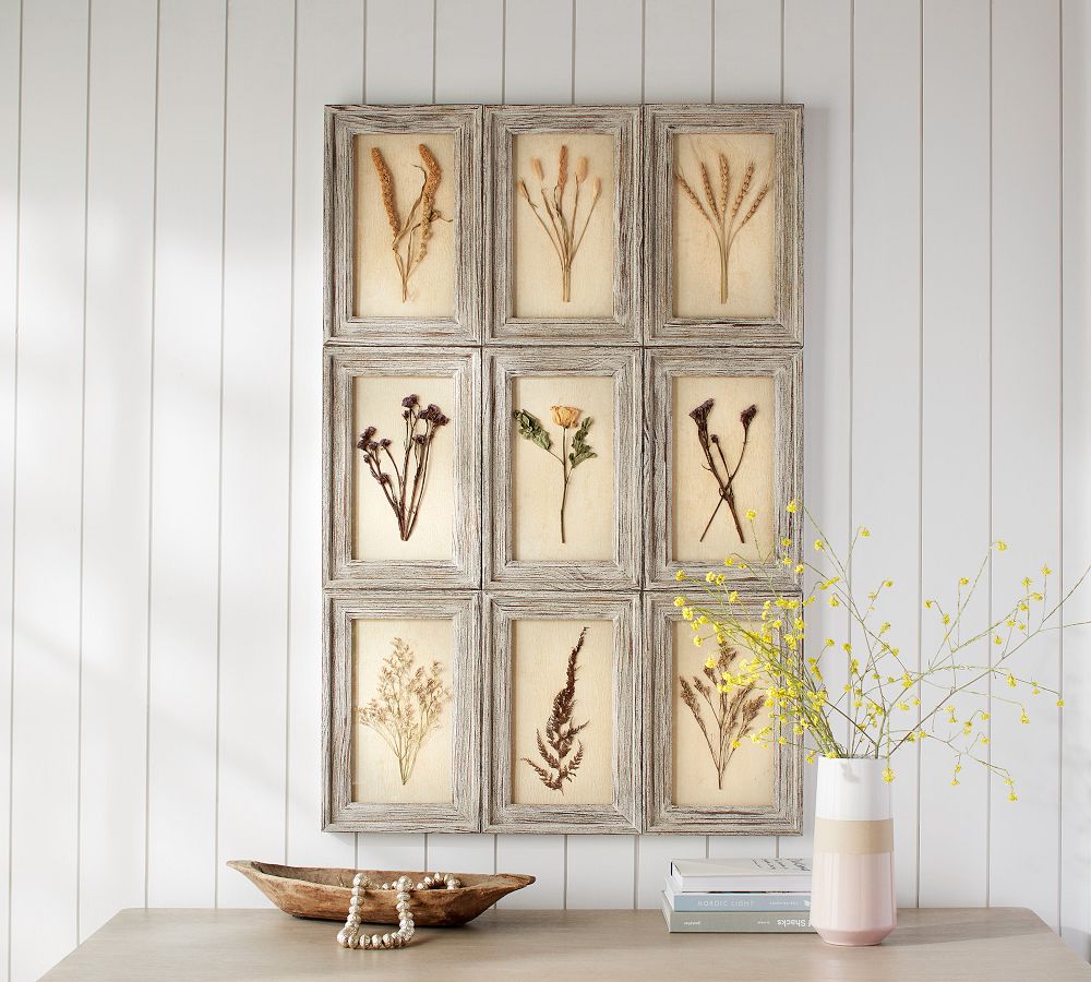 Natural pressed flowers and grains create the organic artwork in our Aiden Wall Art, making each image one of a kind. The frame is crafted of antique wood and accented with metal trim. Part of the Aiden Collection, it has an artisanal look that adds vintage charm to a room.