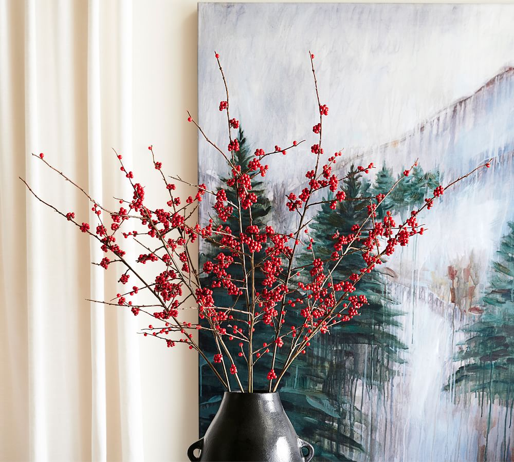 Crafted to look identical to fresh-cut branches, our faux botanical celebrates the stark beauty of red winterberries clinging to bare boughs. Place this extra-large stem in a vase by itself or incorporate it into a garland on the mantel. It is entirely assembled by hand to last through years and years of wintertime displays.