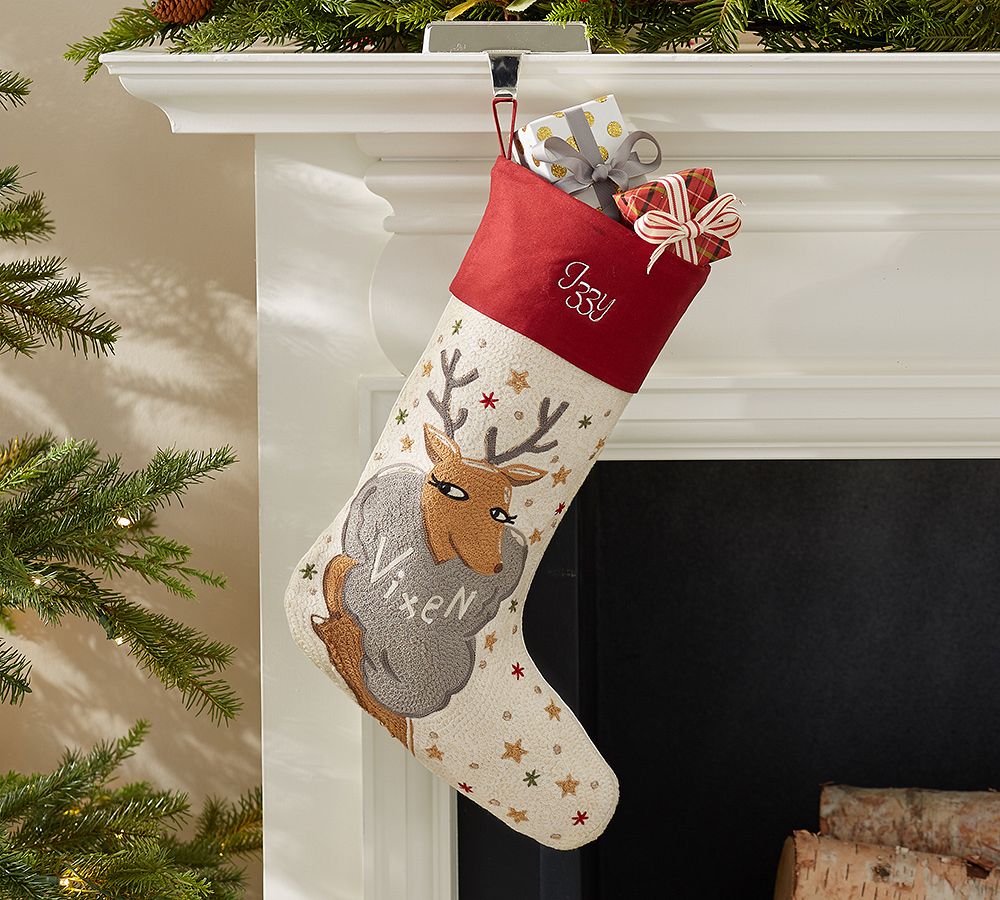 A whimsical portrait of a member of Santa’s antlered team adorns our crewel stocking.