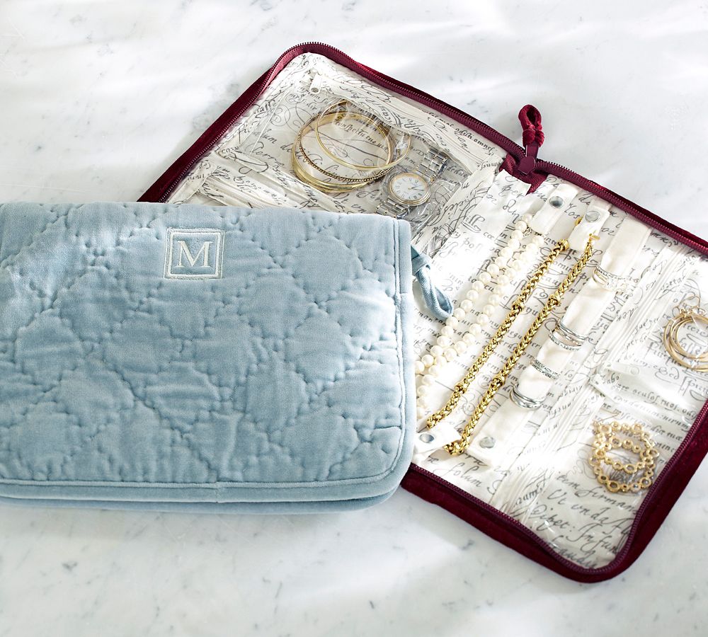 Our jewelry portfolio is crafted of hand-quilted, soft, plush cotton velvet, and has plenty of pockets for organizing and storing treasured accessories at home or on the go.