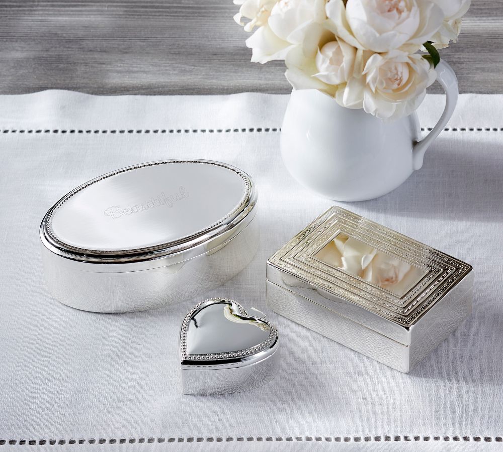 Special keepsakes need elegant storage. With their classic designs and soft velvet lining, the Eclectic Silver Jewelry Boxes hold precious pieces securely in place. The lid can be monogrammed to create a memorable gift. (Each box is sold separately.)