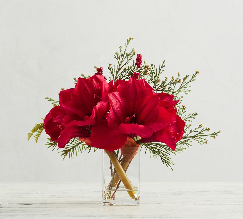 Leave no hall left undecked with this faux botanical arrangement. We combined a few seasonal favorites—evergreen sprigs, holly berries and bright amaryllis blooms—for an accent that instantly turns up the holiday spirit. It comes nestled in a glass vessel so you can incorporate it into your decor or gift to someone else right away.