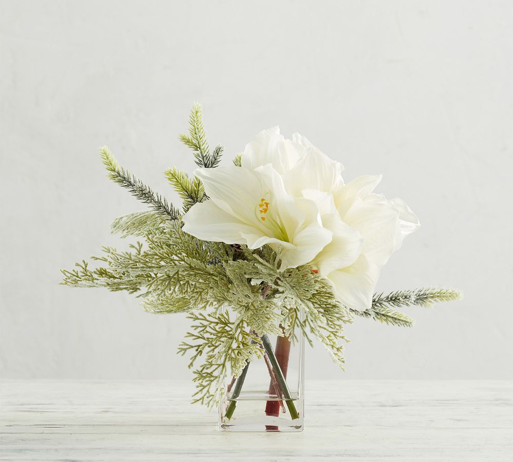 Leave no hall left undecked with this faux botanical arrangement. We combined a few seasonal favorites—evergreen sprigs, holly berries and bright amaryllis blooms—for an accent that instantly turns up the holiday spirit. It comes nestled in a glass vessel so you can instantly incorporate it into your decor or gift to someone else.