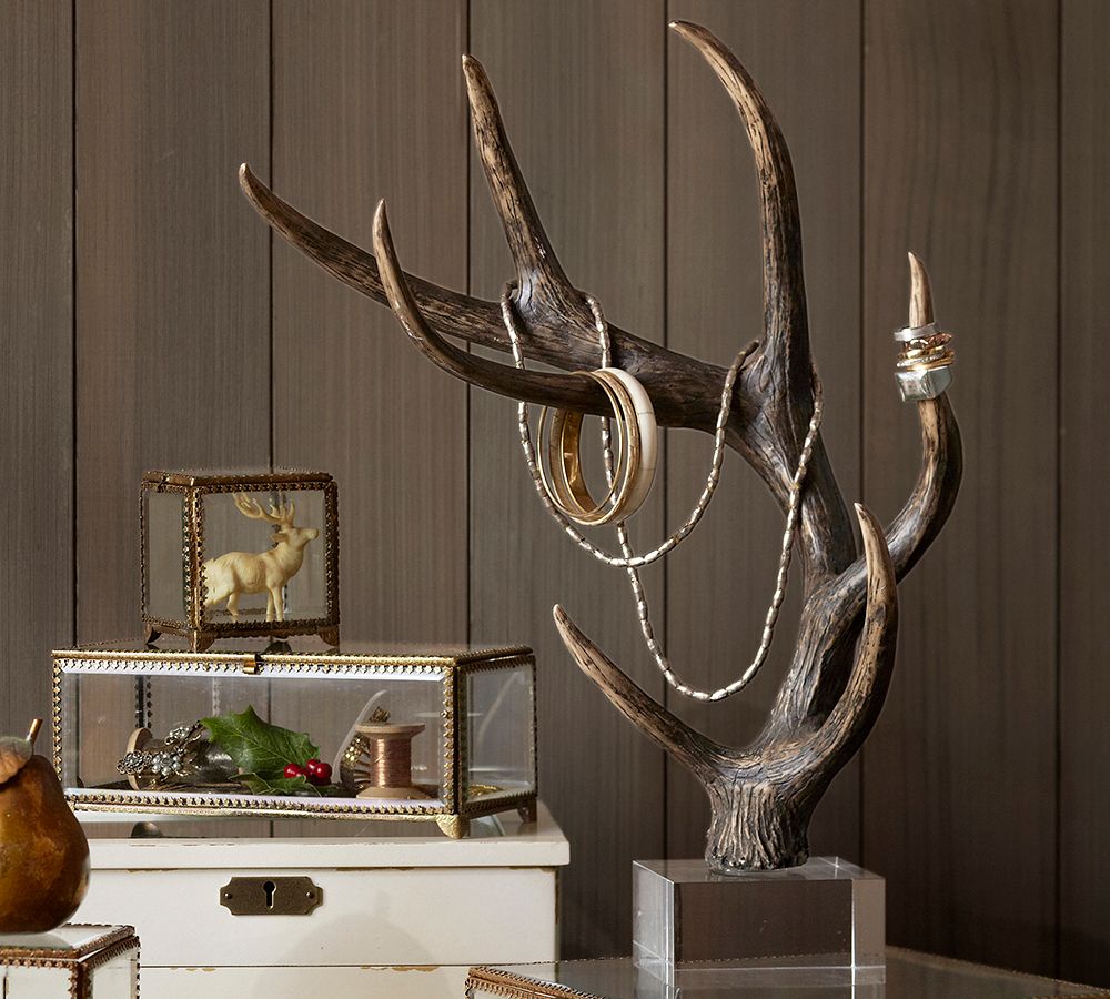 A stag’s antler make a striking base for showcasing necklaces and bracelets.