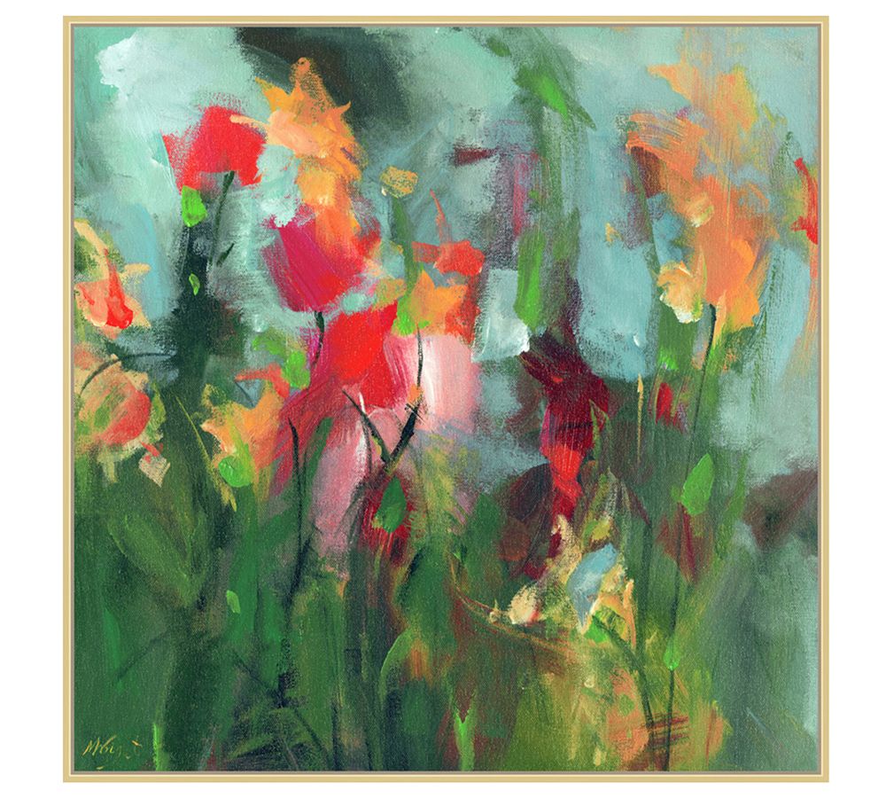 - Gallery wrapped giclée reproduction on canvas in a gold wood floater frame.