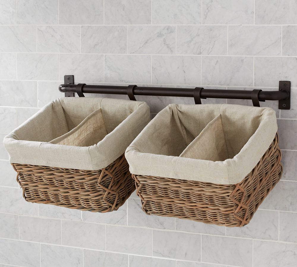 Our Hannah system provides compact, versatile storage that frees up floor space. The lined, moisture-resistant baskets hold everything from toiletries to washcloths, and the bar can be used on its own to hold towels.