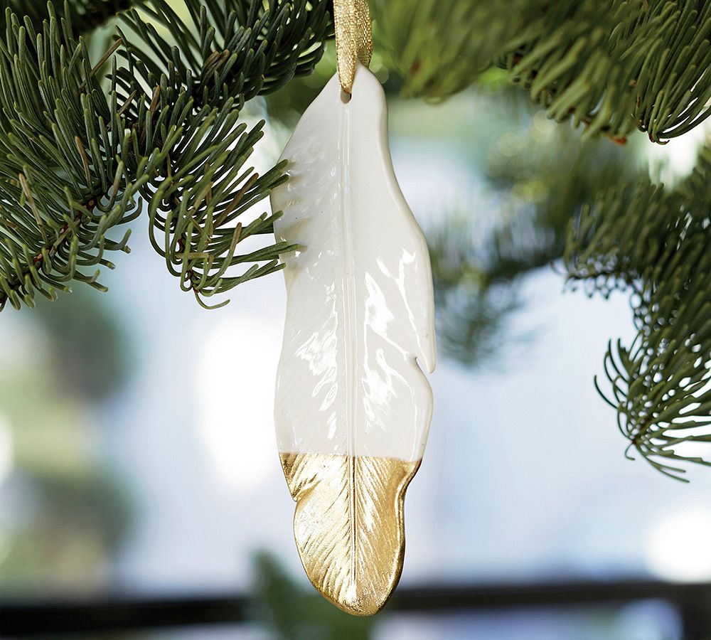 A graceful addition to the tree, our feather ornamant has a touch of gold for a little added shine.