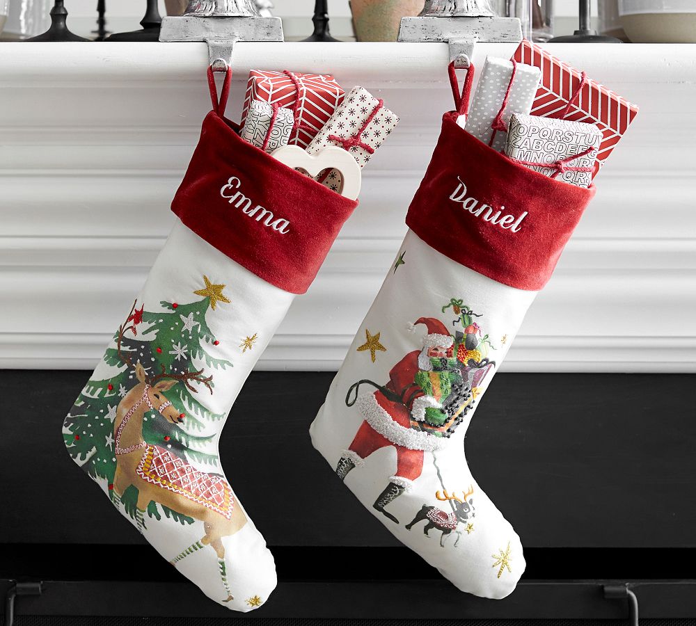 Special delivery! Santa Claus is coming to town, with plenty of festive flair in tow. Originally hand painted in our San Francisco studio, these stunning watercolor scenes offer a decidedly modern take on the most famous Christmas icons. Printed on a beautiful linen/cotton blend, these stockings bring a touch of holiday magic to your mantel.