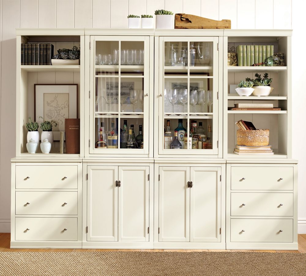- 96"Storage Cabinet includes (2) 24" Cabinet Bases with Doors, (2) 24" Bases with Drawers, (2) 24" Hutches with Open Shelving, and (2) 24" Hutches with Glass Doors.
