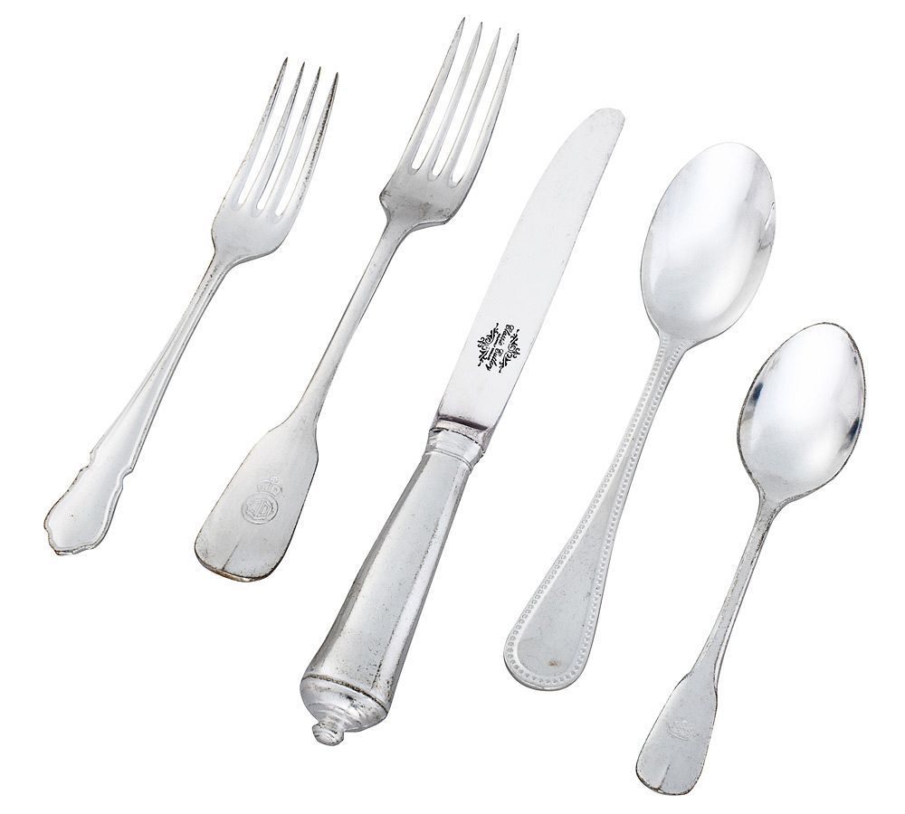 - Dinner fork and teaspoon are embossed with tiny crowns that call to mind the insignias of grand hotels or family crests.