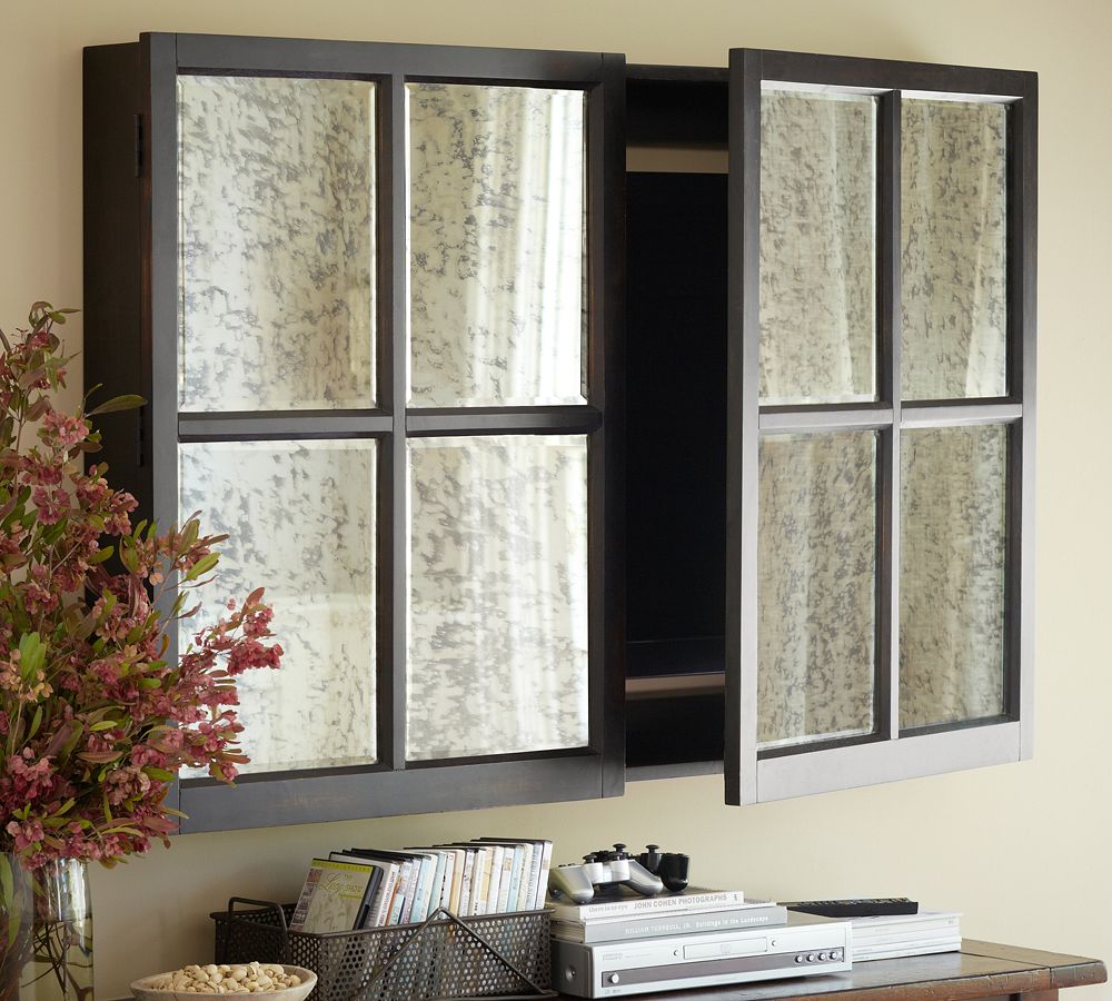 The mirrored windowpanes on these doors are decorative wall art when closed, and are designed to conceal a TV screen when it’s not in use.