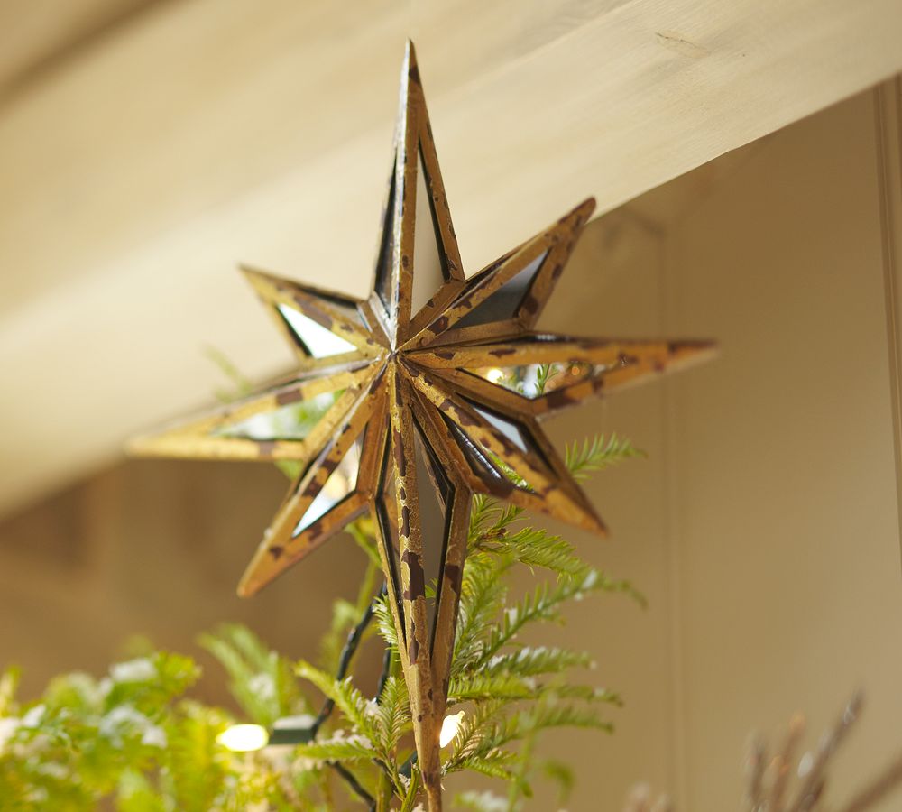 Sixteen mirrored glass panes are hand cut and framed with a rustic gilt finish to make our spectacular tree topper, which is designed to resemble the North Star.