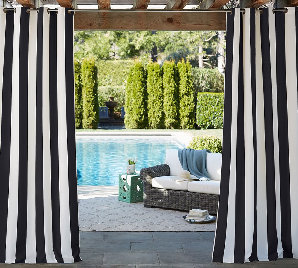 | Open Box: Sunbrella Awning Stripe Outdoor Grommet Curtain, 50" x 108" - Black | No Longer Available |