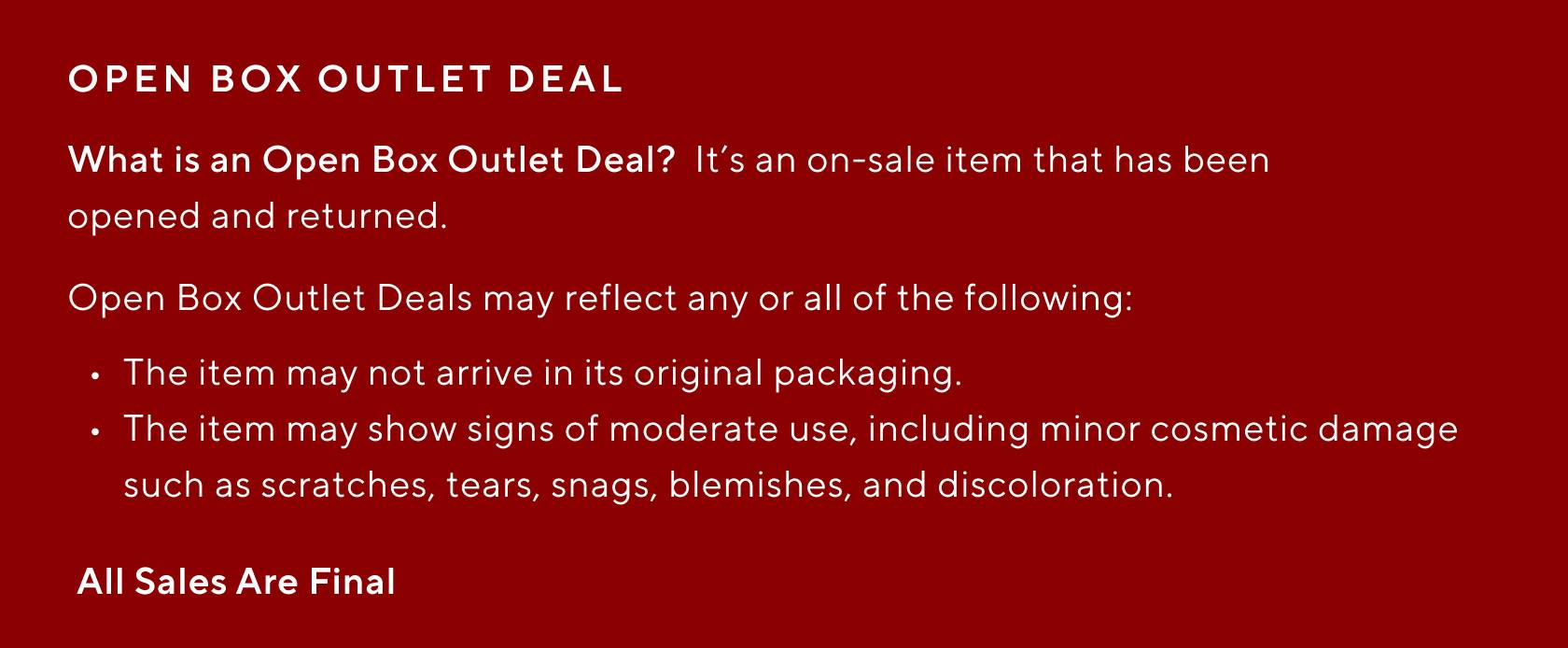 An Outlet Deal may show wear from moderate use. The item may arrive with damaged packaging or be repackaged. It may have minor cosmetic damage, such as scratches on it or show other signs of previous use. The item may be missing accessories and it may not be used until those accessories are purchased separately.