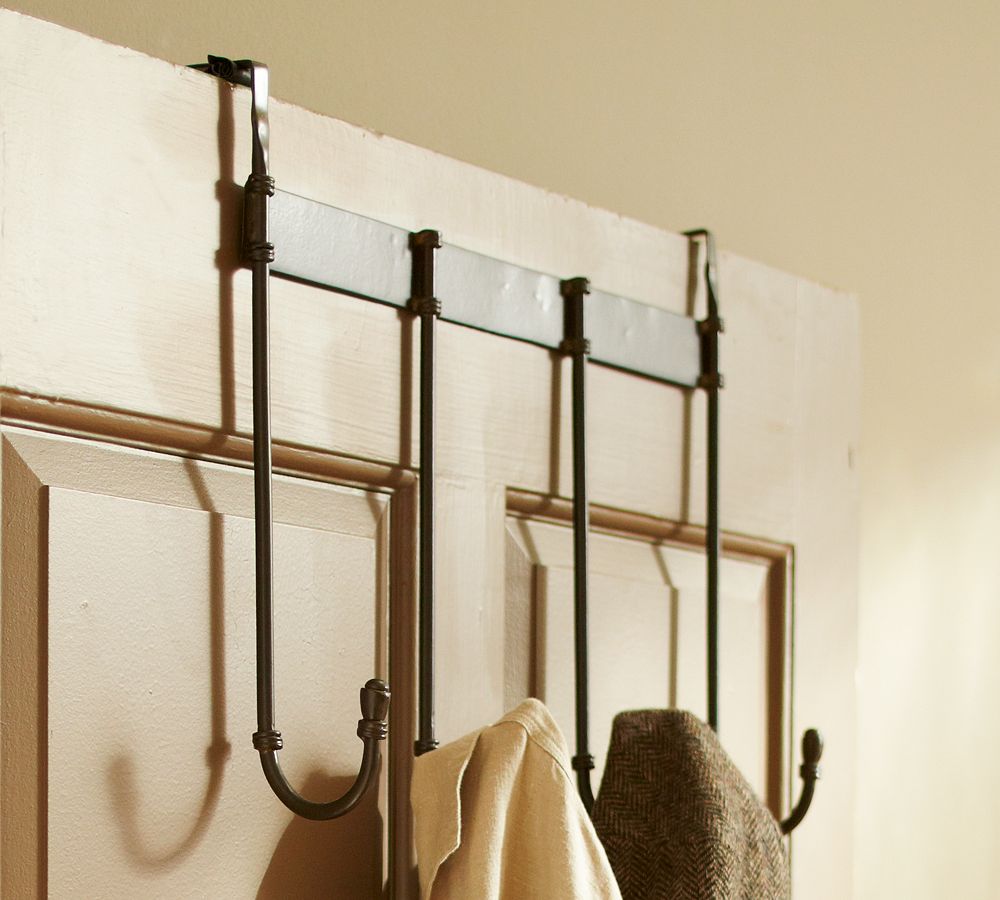 Our clever row of hooks slips over the top of the door to turn unused space into organized storage without the need of nails or screws.