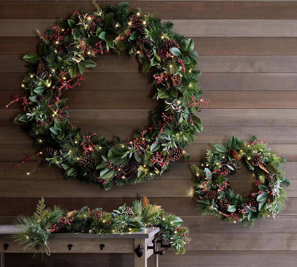 Lit Faux Pine & Berries Wreath & Garland