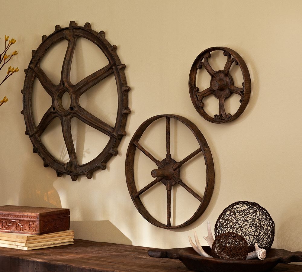Gears in coordinating shapes are modeled after rustic tractor parts discovered in a country store. They take on a unique, sculptural beauty as wall display.