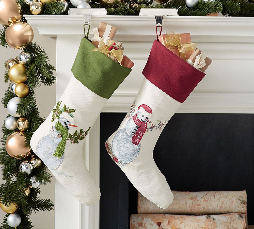 The nostalgic prints on these holiday stockings recall fond memories of building snowmen in the winter.