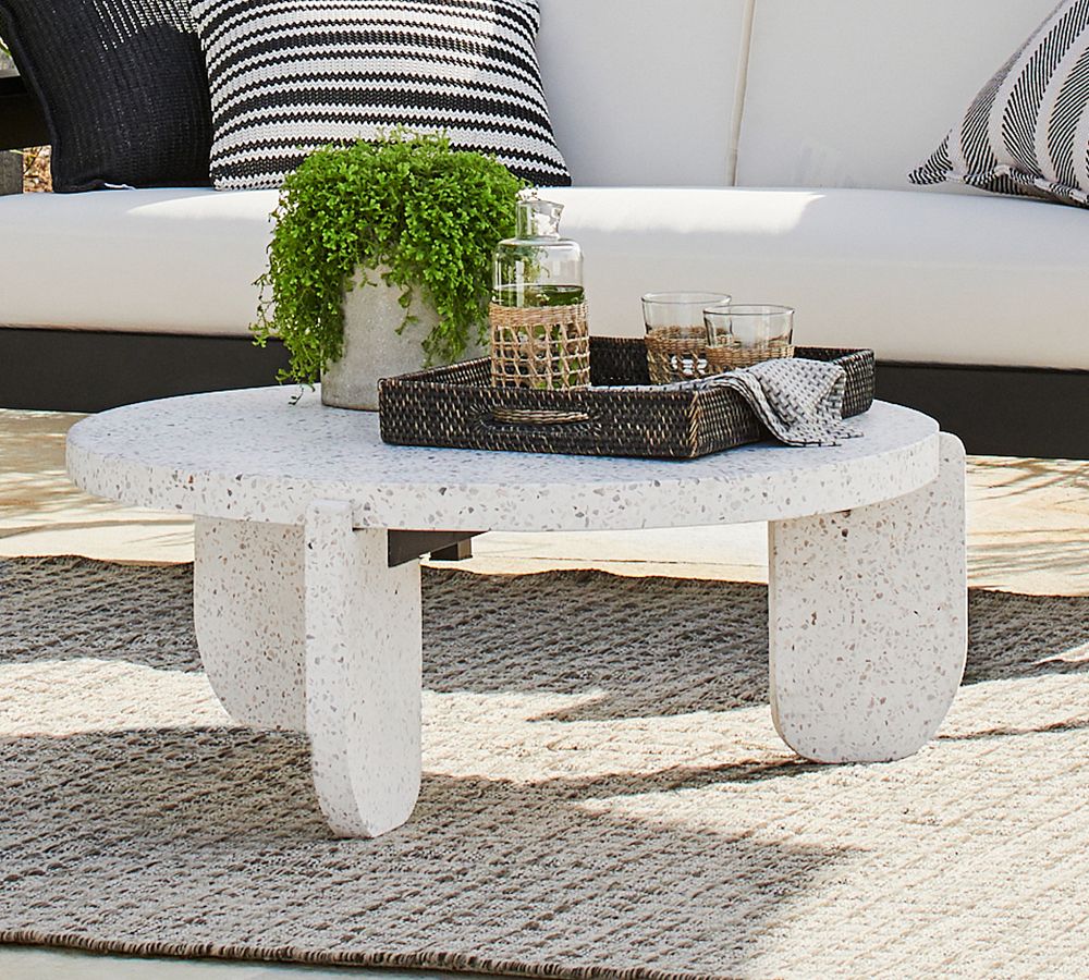 Finding inspiration in mid-century modern style, the outdoor-friendly Terrazzo Round Coffee Table is both nostalgic and of-the-moment. The bold geometric legs and large circular top are crafted of creamy white concrete and speckled with glass fragments in warm, earthy hues.