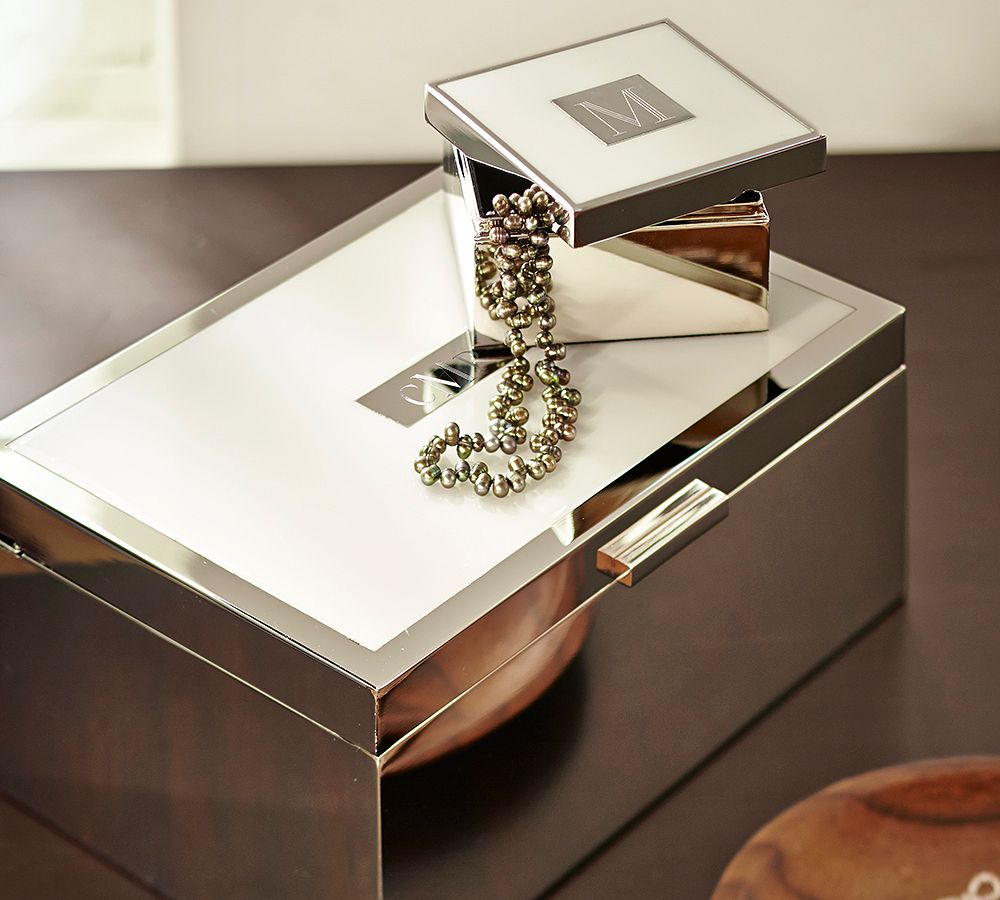 Luxe materials and a pared-down design give this jewelry box a modern makeover. An inset of white enamel frames the polished silver center, creating a handsome backdrop for a monogram.