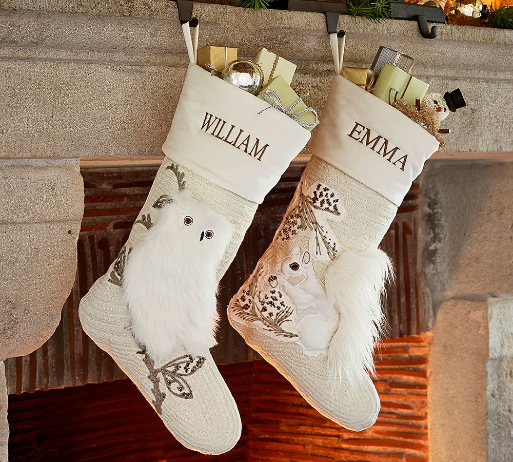 A mix of embroidery, appliqués and velvet softened by feathers and faux fur makes our woodland stockings a soft spot for special gifts.
