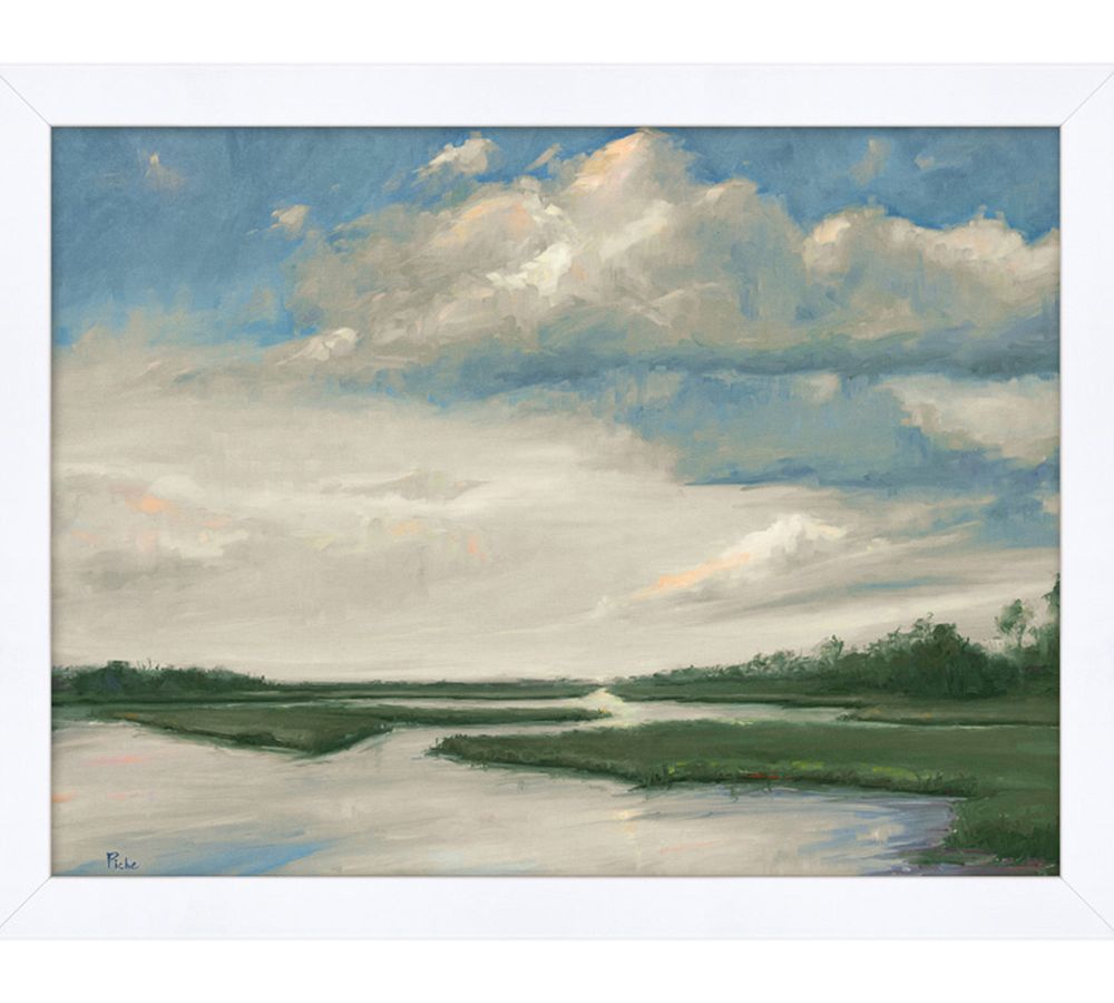 Marshes are one of artist Vanessa Piche’s greatest inspirations for paintings. In this artwork, she captures the drama of light cast on the clouds. The sky seems almost mirrored on the forms of the landscape below.