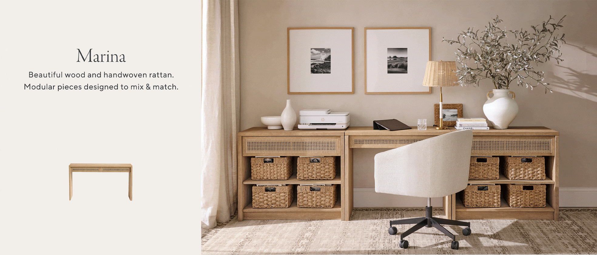 These pieces also fit nicely in home offices. A marina cane desk offers a stylish spot to work or study. Storage cabinets help keep your space tidy and organized.